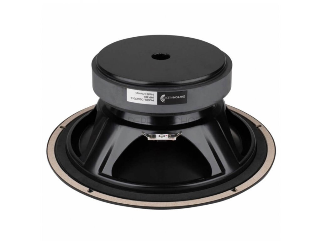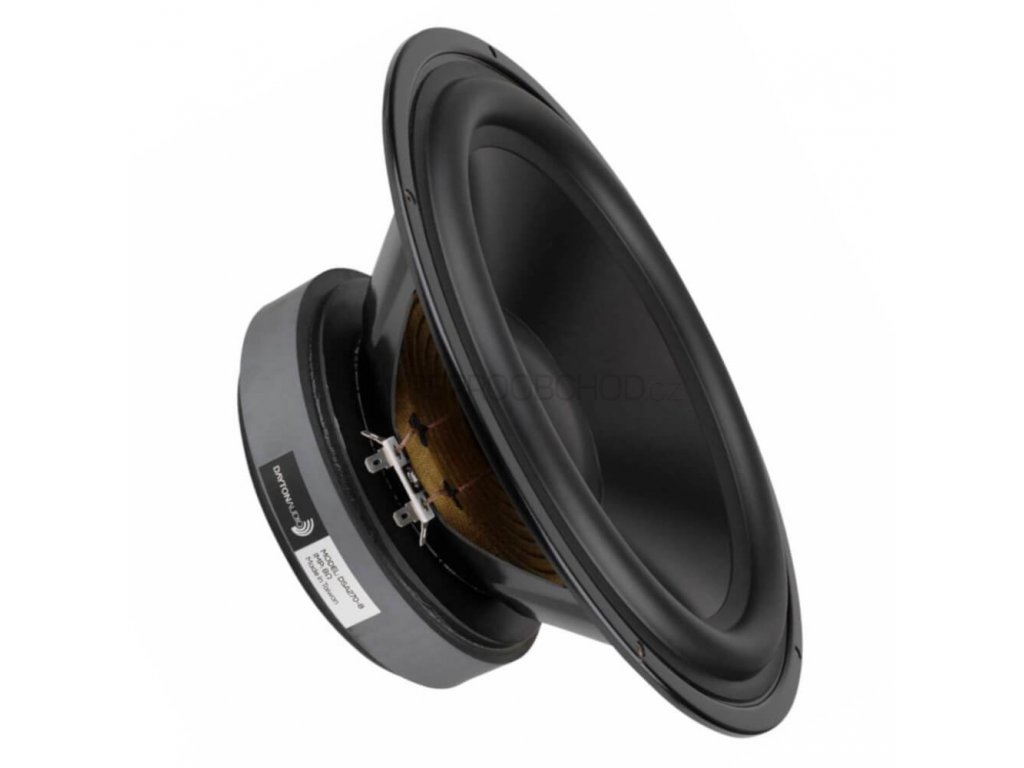 Středobasový značkový reproduktor DAYTON AUDIO s RMS výkonem 100 Wattů a impedancí 8 Ohmů je vhodný pro domácí hi-fi systémy.