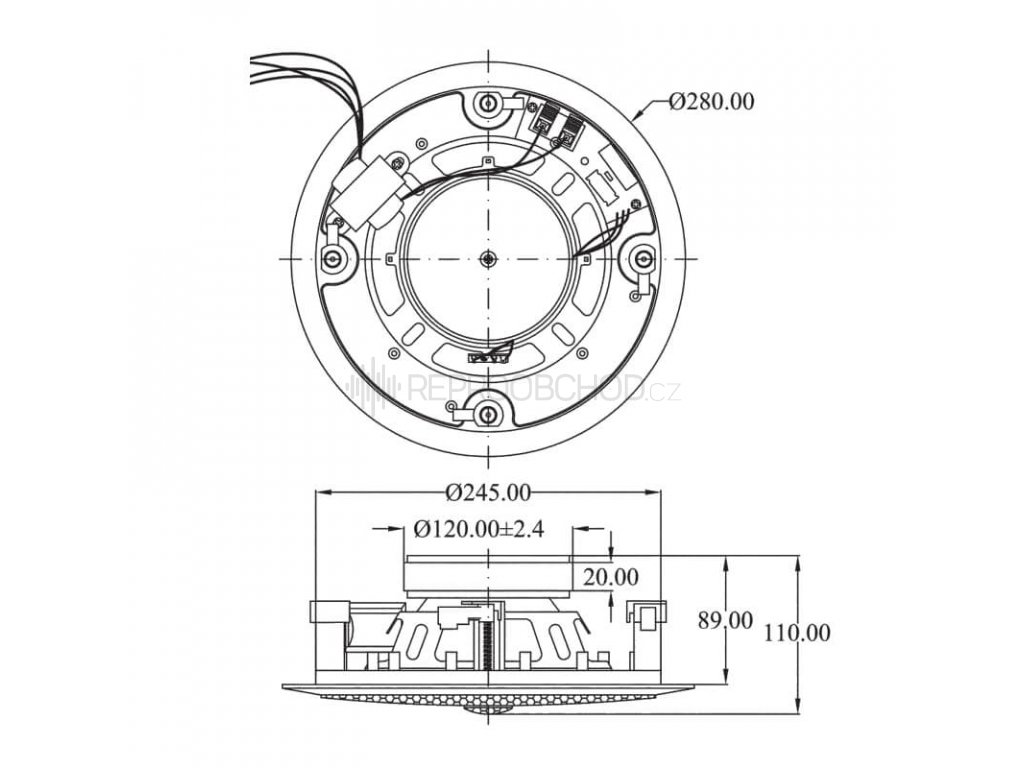 Dexon RP 122 podhledový reproduktor s transformátorem - plastový, hi-fi, 25 W / 400 Ω, 90 dB, 40 – 20 000 Hz, Ø 280 mm, výhybka