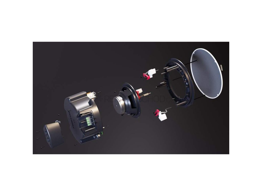 Tělo z ABS plastu odolného vůči UV záření doplňuje bezrámečková hliníková mřížka, díky které reproduktor elegantně zapadne do jakéhokoli stropu. Koaxiální konstrukce s 6" basovým zářičem a otočným 1" výškovým zářičem umožňuje směrování vysokých frekvencí podle potřeby prostoru.