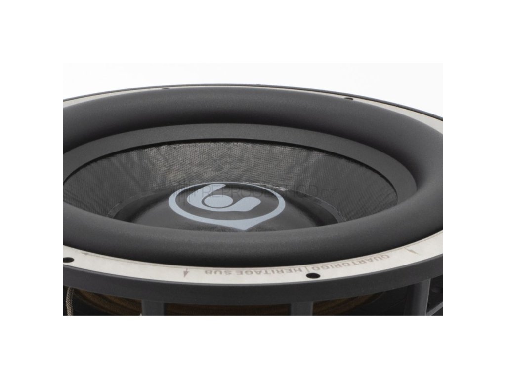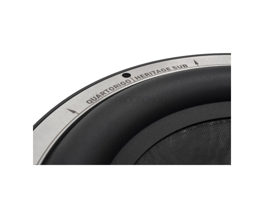 Quartorigo Heritage Sub je 10" (250 mm) subwoofer, který nastavuje novou úroveň výkonu v kategorii SQ subwooferů. Je navržený pro audiofilní poslech a high-end instalace, kde vynikne svou plochou frekvenční odezvou a minimálním zkreslením. Díky lisované papírové membráně s odolným gumovým závěsem, naddimenzované 75mm kmitací cívce a robustnímu ferritovému magnetu nabízí Heritage Sub precizní kontrolu a vysokou dynamiku i při dlouhodobém zatížení.