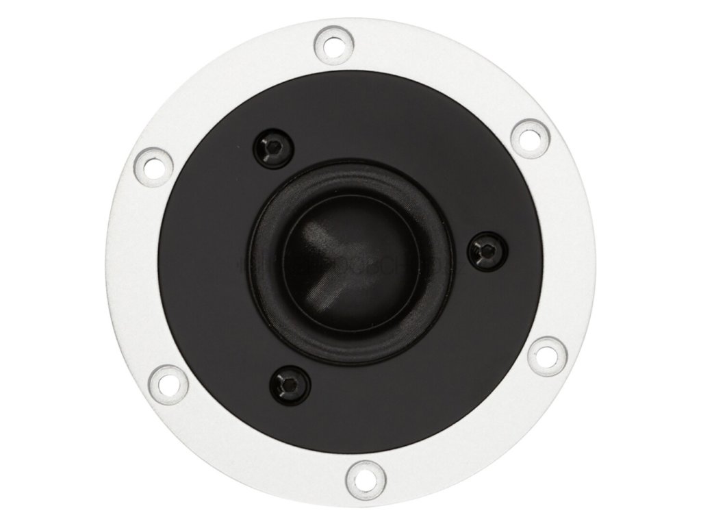 Hliníkový dvoudílný čelní panel s integrovaným mechanickým odhlučněním snižuje zkreslení a přispívá k čistšímu zvuku. Neodymový magnet zajišťuje kompaktní velikost tweeteru bez kompromisů na výkonu.