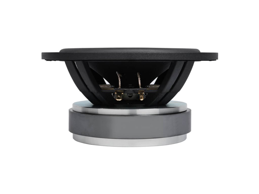 Precizně navržený pohon využívá prodlouženou měděnou objímku a odvětrávané tělo kmitací cívky, což přispívá k nízké indukčnosti, lepší linearitě a stabilnímu chování při vyšším zatížení. Kmitací cívka typu CCAW na nevodivém laminátovém nosiči snižuje pohyblivou hmotnost a zlepšuje odezvu na přechodové jevy.