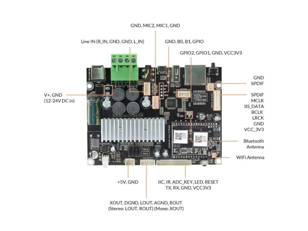 Up2Stream 2.0 Amp V4 využívá zesilovací čip třídy D s nízkým zkreslením a výkonem až 50 W na kanál. Modul podporuje streamování z mnoha služeb, včetně Spotify, Deezer, Tidal, Qobuz, Napster či internetových rádií. USB port lze použít jako USB DAC nebo pro přehrávání hudby z flash disku. Ovládání je možné přes aplikaci, počítač nebo volitelný IR dálkový ovladač.