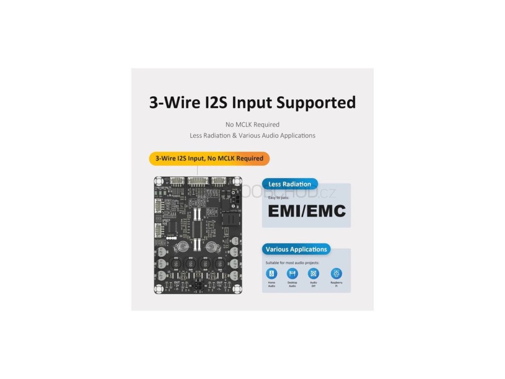 Sure Electronics AA-AB32257 je kompaktní dvoukanálový modul audio zesilovače třídy D s výkonem 2 × 50 W, který využívá integrovaný obvod Texas Instruments TAS5768. Nabízí čisté zesílení, vysokou účinnost a spolehlivý provoz v širokém rozsahu napájecího napětí, což z něj činí vhodné řešení pro DIY projekty, stereo sestavy i zakázkové audio aplikace.