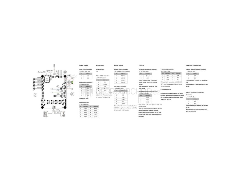 Integrované Bluetooth 5.0 podporuje kodeky aptX, aptX HD, aptX-LL, SBC i AAC a díky vysoké citlivosti příjmu poskytuje stabilní bezdrátový přenos. Čtyři konektory pro externí potenciometry umožňují pohodlné ovládání hlasitosti, zesílení a filtrů. DSP lze konfigurovat přes SigmaStudio, mobilní aplikaci nebo PC UI pomocí rozhraní ICP.